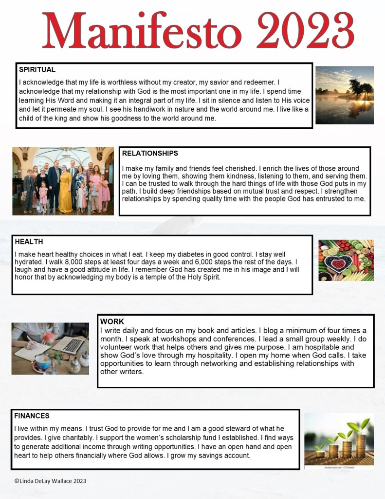 The manifesto I worked on encompasses several areas of life: spiritual, relationships, health, work, and finances. Last year I did the same challenge and I met some of my goals, but others went by the wayside. This year was a good opportunity to revisit my goals and I prayed about what my life needs to look like.