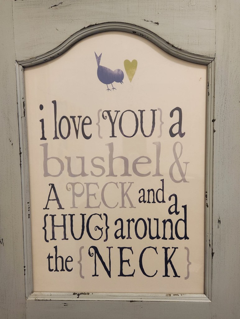 For some reason that simple refrain brings back one of the few fuzzy, warm memories of my mom during childhood. I can still see her singing that song to me when I was little. In some ways it eases the more frequent memories of her criticisms when I was growing up. (Just for the record, in her late thirties my mom went to nursing school and once she had a career, she was a much happier woman and it showed in her parenting.) I found a picture with the saying, “I love you a bushel and a peck” on it and I gave it to my mom for Christmas one year. Since Mom’s death it has hung in my home, a constant reminder to me of a happy occasion.